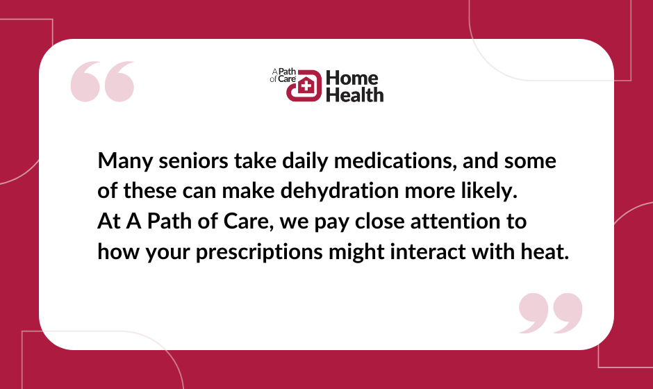 Many seniors take daily medications, and some of these can make dehydration more likely. At A Path of Care, we pay close attention to how your prescriptions might interact with heat. Diuretics (sometimes called "water pills"), blood pressure meds, and certain antidepressants can: